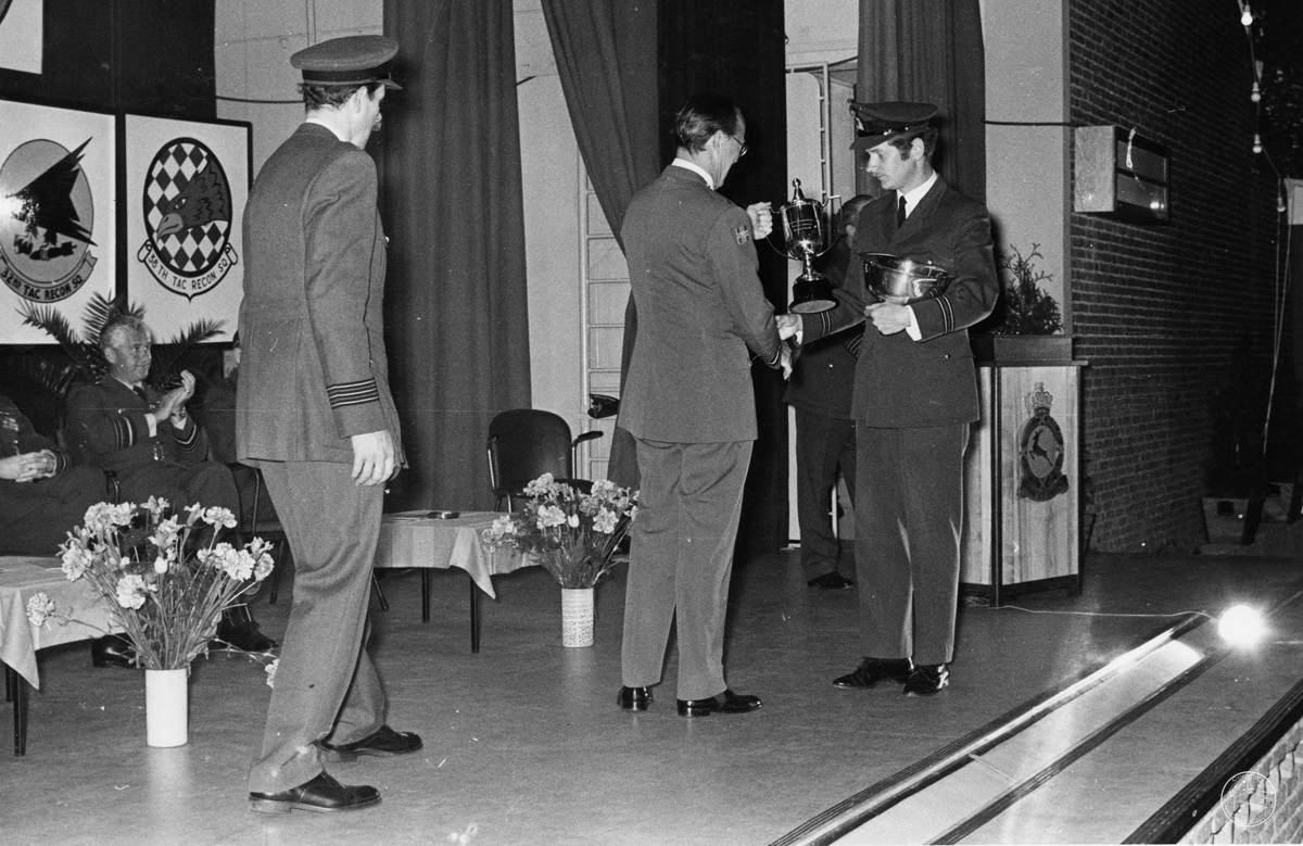 De grote prijs hiervoor werd de leider van het fototeam, Kapitein A.J. van Hulst, overhandigd door Prins Bernhard, tijdens de slotceremonie, die onder veel en hoge belangstelling plaats vond in de versierde kantine van de LETS op 15 mei. Eveneens was er vreugde over het behalen van de op een na beste plaats door bet personeel van het 306 fotolaboratorium voor de productie van de foto’s. Een uitstekende prestatie, vooral indien men het ter beschikking staande materiaal vergelijkt met dat van andere deelnemende teams. Ook vlieger Sgt1 J.C. Kienstra zal prettige herinneringen bewaren aan de 15e Royal Flush, waarin hij als vierde eindigde in het algemeen klassement van 26 collega vliegers. Het 306 Squadron bereikte als onderdeel de tweede plaats en dat mag vermeld worden.